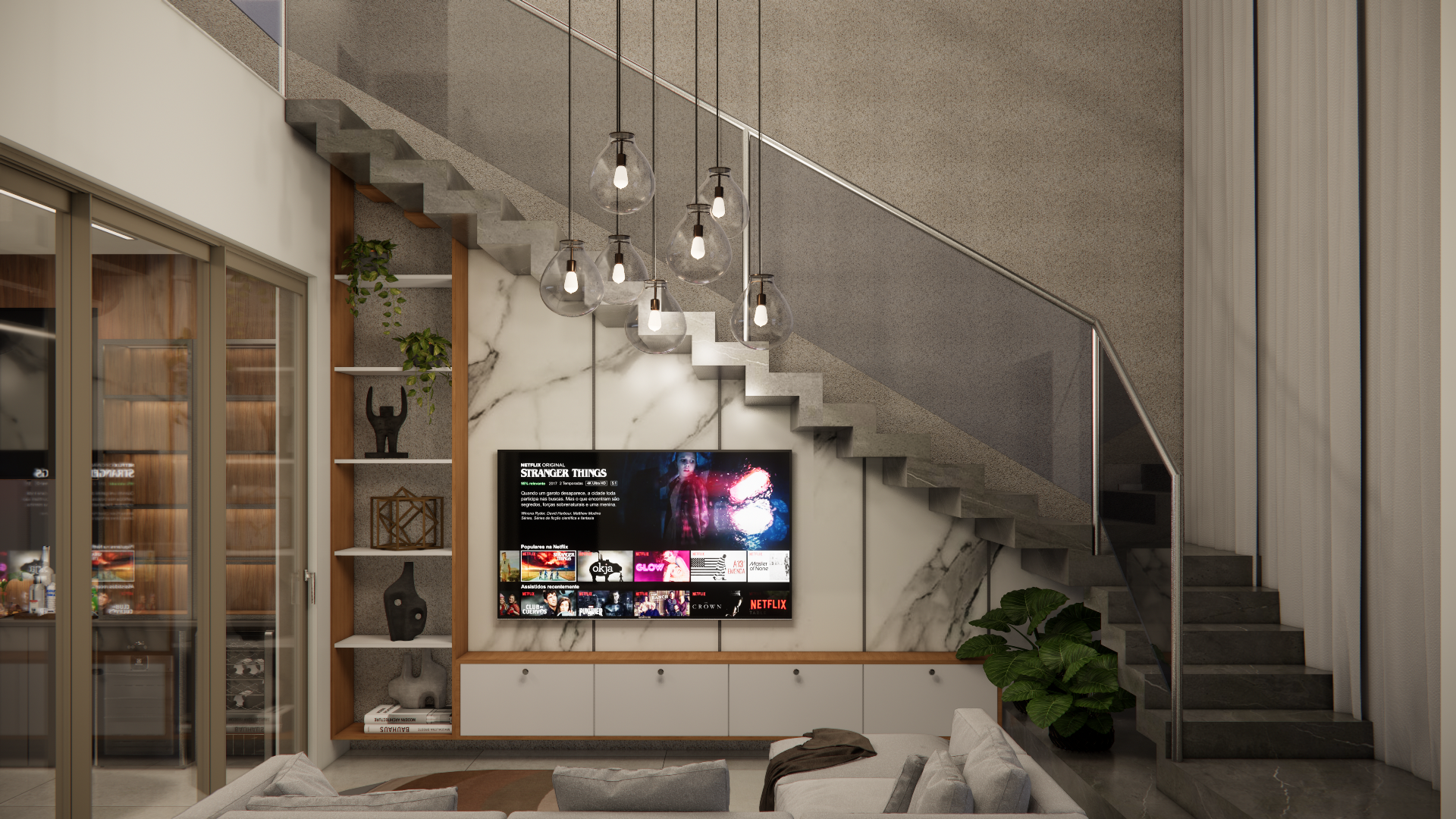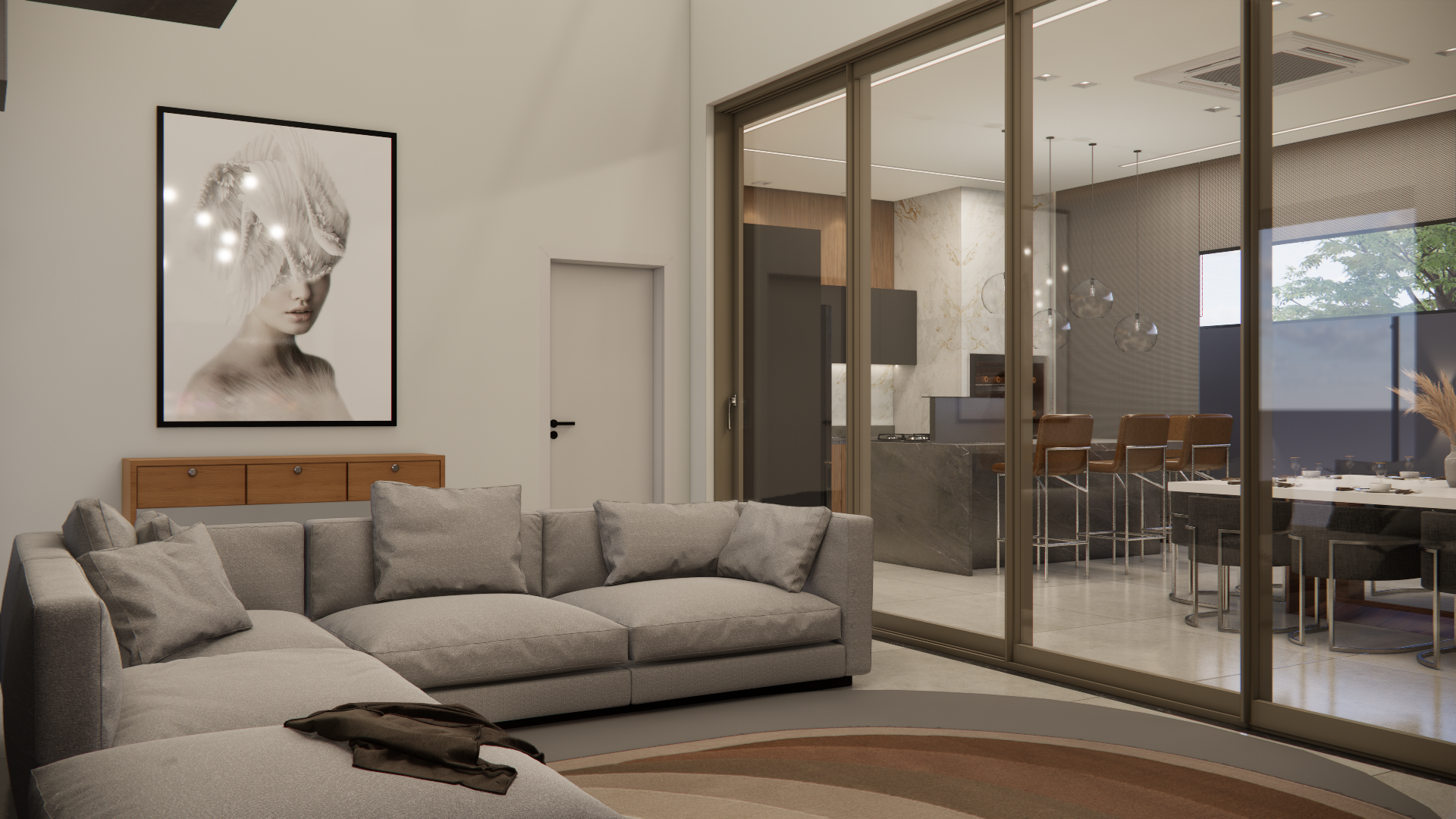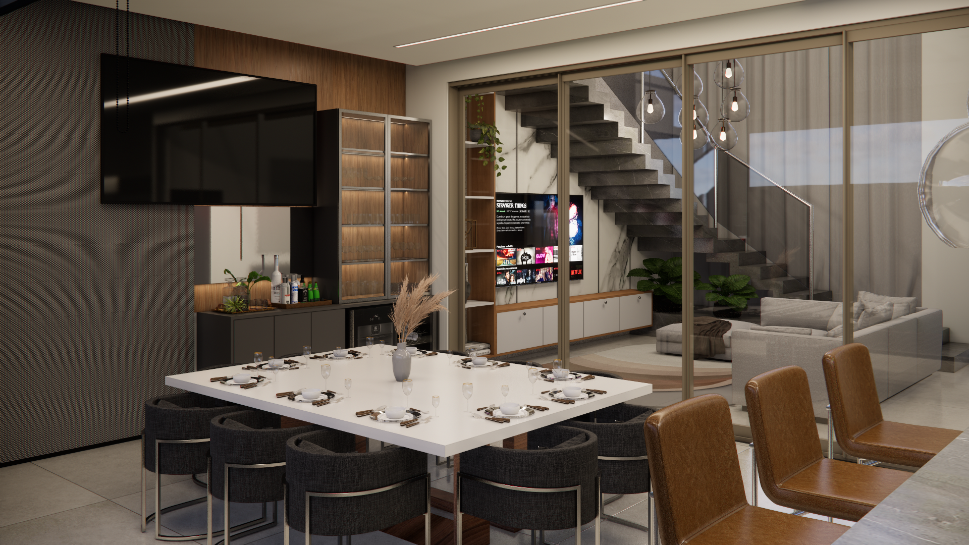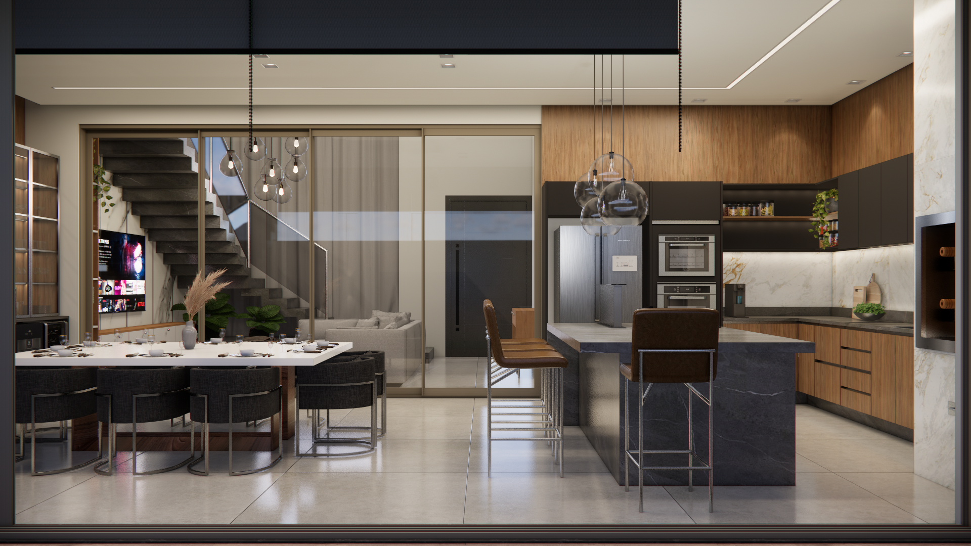 O projeto residencial foi desenvolvido com foco em criar um ambiente acolhedor e familiar, utilizando materiais claros e amadeirados para transmitir uma sensação de conforto e bem-estar. Com a intenção de destacar a importância da convivência familiar, foram projetados ambientes amplos e aconchegantes que facilitam a interação e a recepção de convidados. Ao entrar na casa, a visão é imediatamente atraída para a área de lazer, onde a piscina com uma elegante cascata se destaca, criando um ponto focal visualmente impressionante. A área gourmet adjacente complementa o espaço, proporcionando um ambiente perfeito para encontros e celebrações em família.
